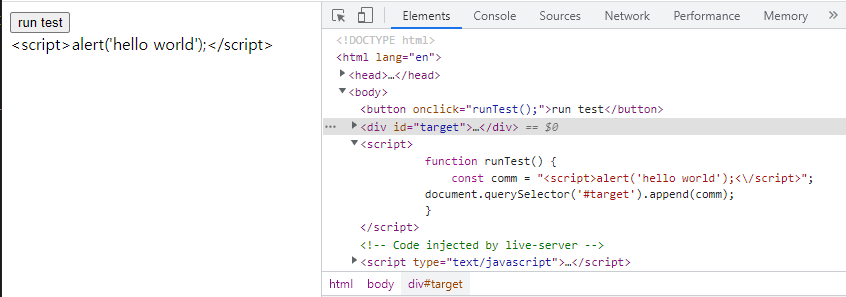 - ele.innerHTML 속성을 이용해서 <script> 태그를 추가했을 때 ( 실행 X ) -